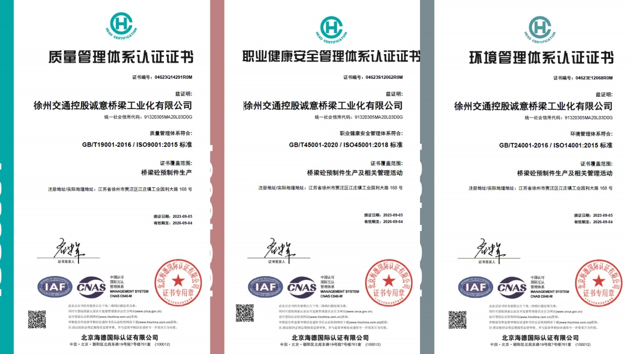 近日,徐州交通控股誠意橋梁工業(yè)化有限公司(以下簡(jiǎn)稱(chēng)冠盛橋梁公司)順利通過(guò)了ISO9001質(zhì)量管理體系、ISO14001環(huán)境管理體系以及ISO45001職業(yè)健康安全管理體系的“三體系”認證,同時(shí)榮獲了認證證…